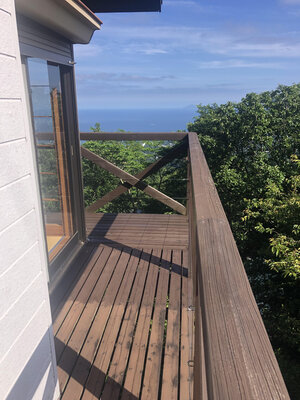 山の斜面に建っている為、この空中デッキは真下の斜面から8mくらいの高さにあります。