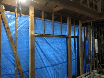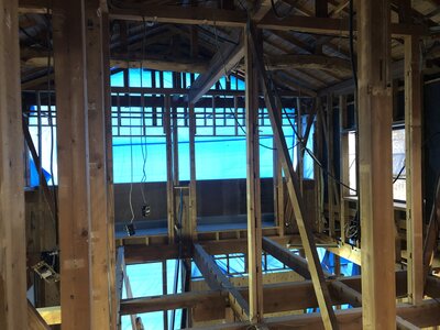 新しく設置した「柱・筋交い・間柱」の色が、廻りの元々あった柱等比べて、新しい木肌色になっているのが良くわかると思います。